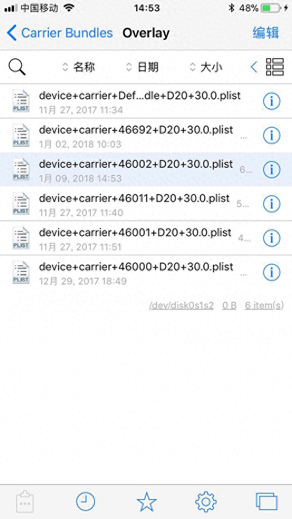首先在手机上打开 FilzaJailed,进入路径 /Var/Mobile/Library/Carrier Bundles/Overlay,就可以看到如下文件。