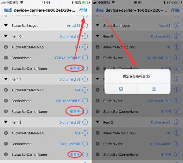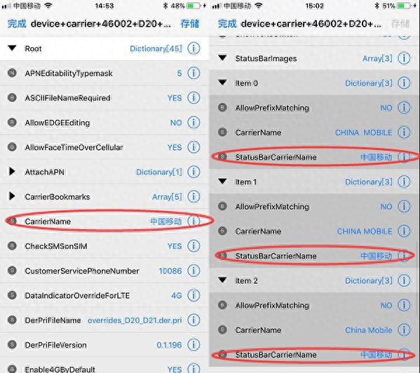 然后,依次打开寻找自己设备所用运营商的名字(这里以中国移动为例),一般会出现在 CarrierName 中,点击右边的「i」修改成自己喜欢的文字。然后继续找到 StatusBarImages ,点击「▼」展开信息,可以在 Item 0 、Item 1 和 Item 2 中看到 StatusBarCarrierName 后面显示中国移动,点击右侧「i」进行修改,然后存储修改结果。