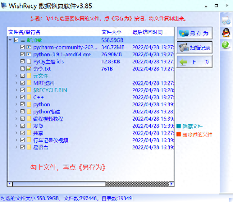 步骤3:勾上所有需要恢复的数据,然后点右上角的《另存为》按钮,将勾上的文件COPY出来。