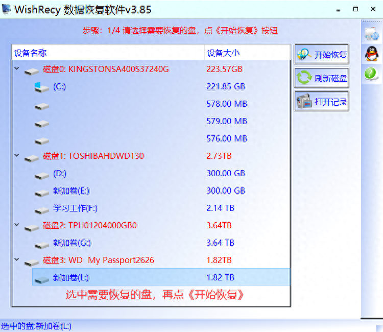 步骤1:先下载并解压软件打开后,选中需要恢复的盘,然后点《开始恢复》按钮