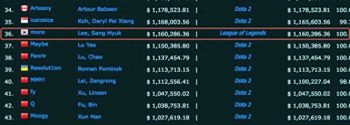 不过在个人奖金榜单上,李哥faker依然以$ 1,160,286.36高居所有英雄联盟职业选手榜首: