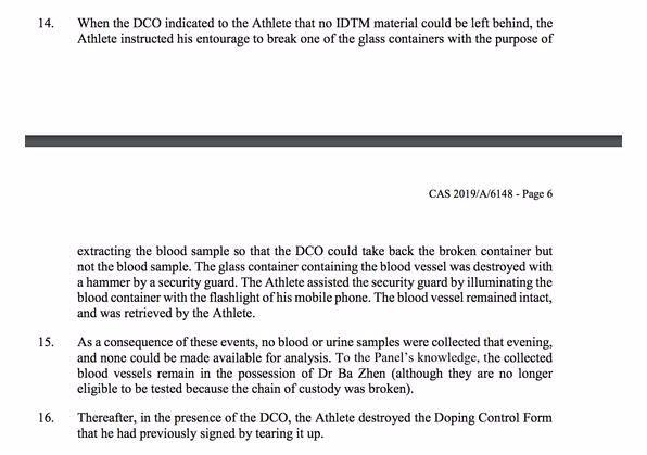 此后,孙杨在社交媒体上晒出各种“证据”,表示自己并没有暴力抗检,但是,国际体育仲裁法庭显然不这么看,他们甚至发布官方通告,直指孙杨暴力抗检。在CAS最新的仲裁报告中,孙杨在接受药检的过程中,保安用锤子砸碎了检测瓶,并且孙杨撕毁了药物检测表。