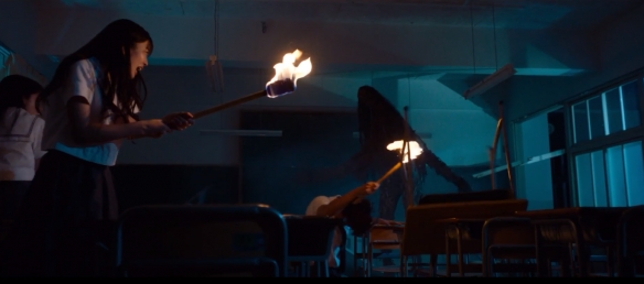 所以影片后半部分就完全变成日式青春片了,恐怖的气氛大打折扣。以校园作为背景,抛开惊悚片段,更多的篇幅还是围绕青春期的少男少女学生时代遇到的迷茫和困境,以及在严酷环境下他们之间的友谊和羁绊。