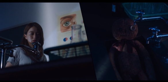 影片前三分之一的部分是青春校园加恐怖,氛围感营造很足。看完之后也会对拿着布娃娃的“红人”印象深刻,不管是把人钉在墙上的血浆迸发,还是一刀把男同学的身体切成两半,都足够有画面冲击。