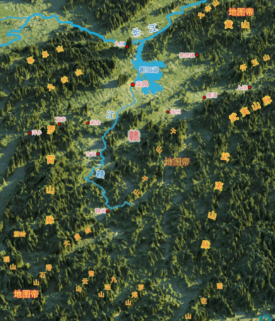 江西位于我国中部地区、长江中下游南岸,按顺时针方向,分别与湖北、安徽、浙江、福建、广东、湖南相邻。江西地形比较封闭,东、西、南三面环山,东北方向与安徽、浙江交界处有怀玉山、黄山等山脉,东南方向与福建之间有绵延五百多公里的武夷山脉,南面与广东之间有著名的南岭,西面与湖南之间是罗霄山山脉,西北部与湖北之间有慕阜山。北面虽然山少,但又有长江。