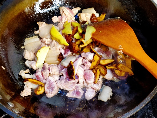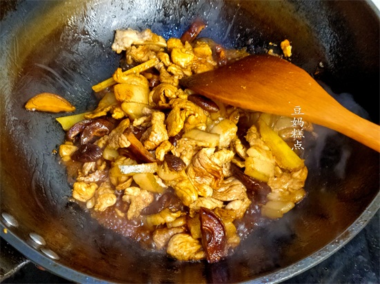 加入姜片、香菇一起翻炒均匀。