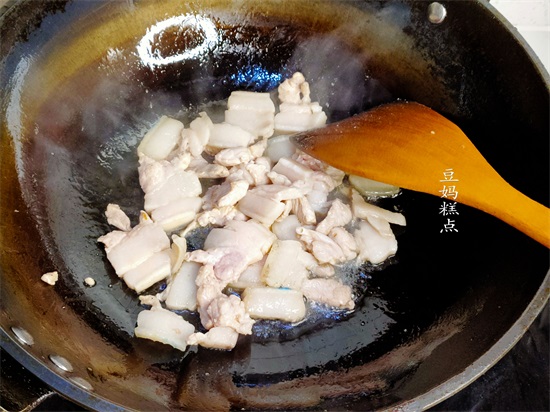 首先,锅里放少许油,放入肥肉部分煸炒出油。