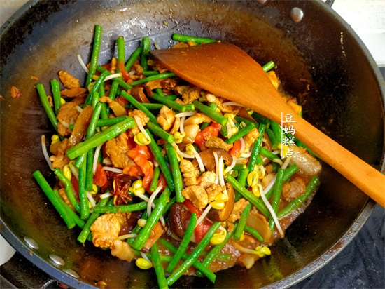然后再倒入豆角、黄豆芽一起翻炒均匀。