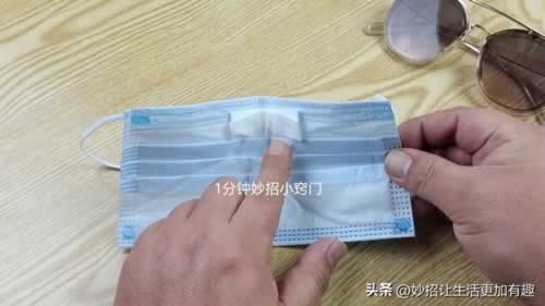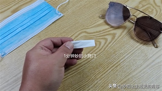 接着,我们在纸巾上粘贴双面胶,利用双面胶,把纸巾粘在口罩的上方,也就是我们用来贴合鼻梁的部位。纸巾的手感比较柔软,这样在我们佩戴口罩的时候,也会比较舒适。而且纸巾的吸水性非常好,在我们每次吸气,呼气的时候,就可以吸附掉雾气,这样即使眼镜戴一天,镜片上面也不会起雾。