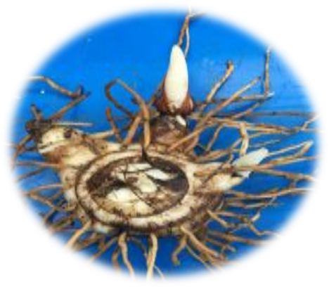 本品呈不规则扁圆形,多有2~3个爪状分枝,长1.5~5cm,厚0.5~1.5cm。表面灰白色或黄白色,有数圈同心环节和棕色点状须根痕,上面有突起的茎痕,下面有连接另一块茎的痕迹。质坚硬,不易折断,断面类白色,角质样。气微,味苦,嚼之有黏性。