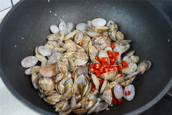 第四步:锅中倒入适量油,油五成热后倒入姜丝和蒜末,小火煸炒出香味后加入花甲、小米椒大火翻炒,翻炒1分钟倒入2勺料酒去腥,盖上锅盖小火将花甲焖1分钟。