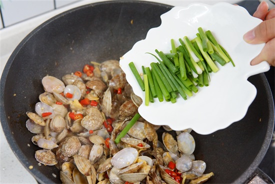 第五步:等待锅中的汤汁渐渐变多,花甲全部开口后,加入小葱,倒入1勺盐、1勺耗油、半勺白糖,翻炒均匀后出锅即可。