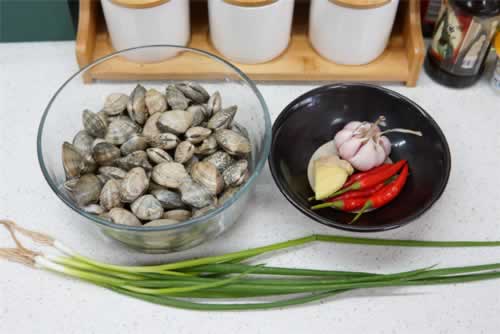 所需食材:花甲500g,小葱一小把,小米椒一小把,姜一小块,蒜一头,盐1勺,料酒2勺,耗油1勺,白糖半勺。
