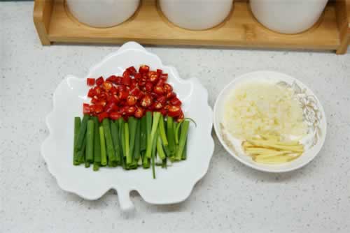 第二步:在等待花甲吐沙的时间可以准备配料,将小葱摘洗干净后切成小段,小米椒切成小圈儿,蒜切末姜切丝备用。