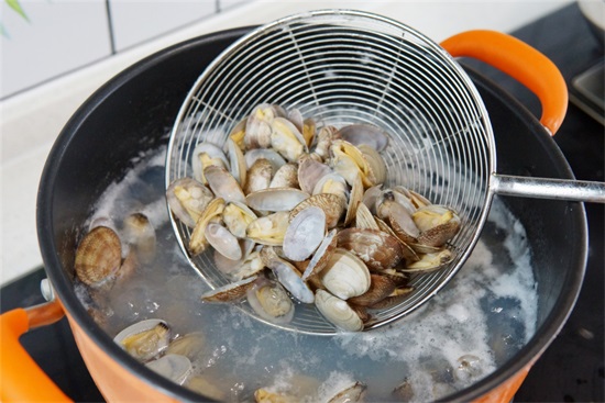 第三步:锅中加入适量清水,将花甲倒入焯水,焯好水后将花甲捞出放置清水中再次冲洗一下,冲洗干净后淋干水分备用。