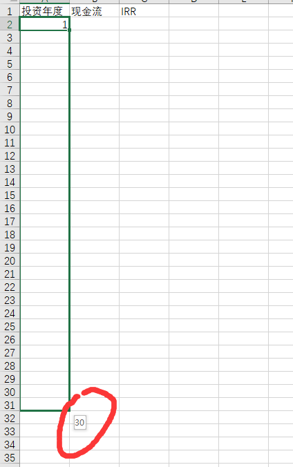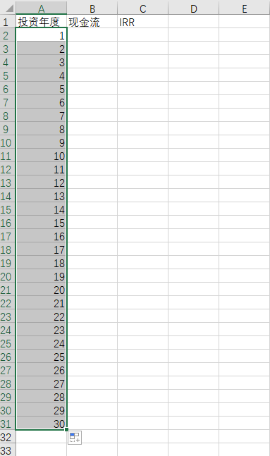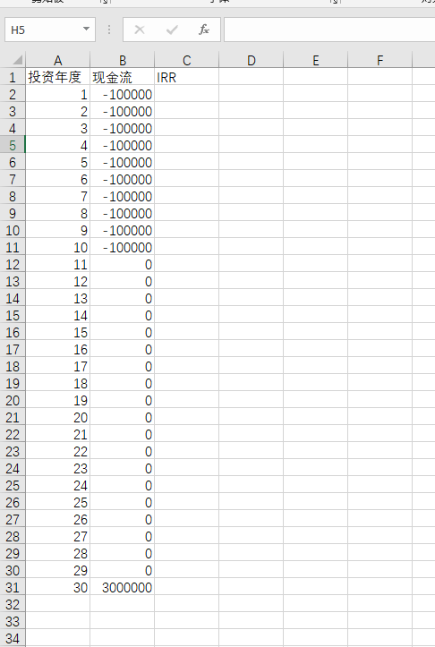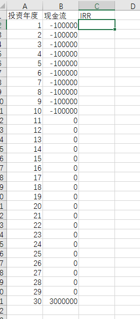 然后第30年是一次性返还300万,现金流就是“3000000”,中间的其他年份因为没有现金流就填写0。填写完之后表格应该是这样的: