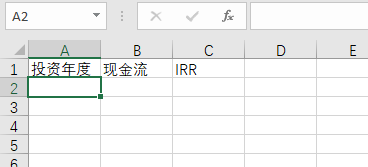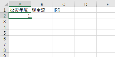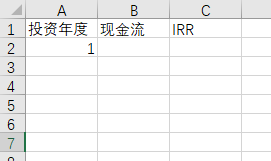 3、在A1位置输入投资年度,B1位置输入现金流,C1位置输入IRR