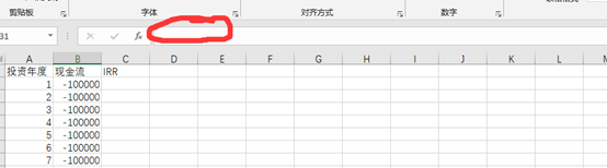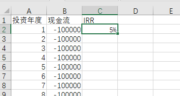 这里我们还是用之前的文章里面虚构的那个年金险:每年交保费10万,连续交费10年,在第30年的时候一次性返还300万。所以我们要在现金流里面填写数字,前十年的现金流因为是支出的,所以是“-100000”,其他的保费数量根据实际情况自己填写。