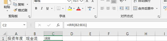 12、在公式编辑器里面输入“=IRR(B2:B31)”