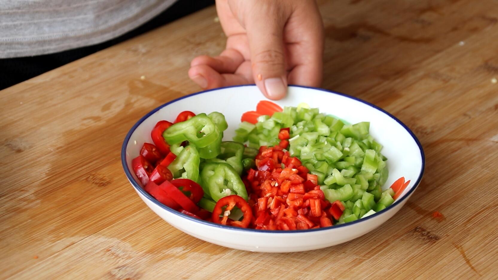 2、处理配菜:发面过程准备配菜,青红辣椒从中间切一个,青辣椒去头去籽,切成丁,红辣椒切一下,红辣椒切成丁,盛入盘中备用,剩下的一半青红辣椒切成圈,放入盘中,切点洋葱,切成丁,准备午餐肉,将午餐肉切成薄片,中间切一刀放盘子里面,芝士切成条,放在纸上面