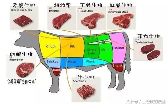 牛不同部位的肉有不同的分工,被做成牛排自然有不同的名称,比如菲力丶肋眼丶沙朗丶纽约客丶牛小排……很多人都会被搞得晕头转向,看看下图你就清楚了。