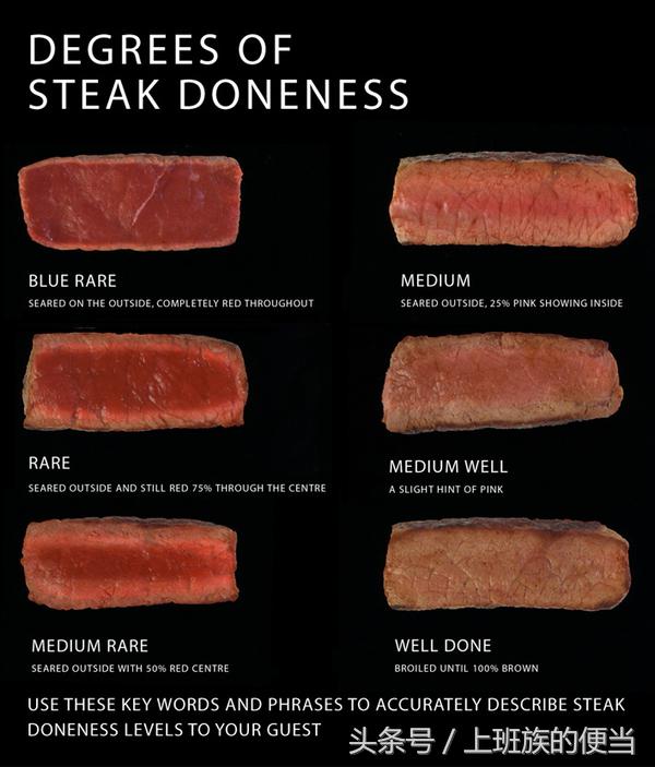 不同熟度的牛排大概是这样: