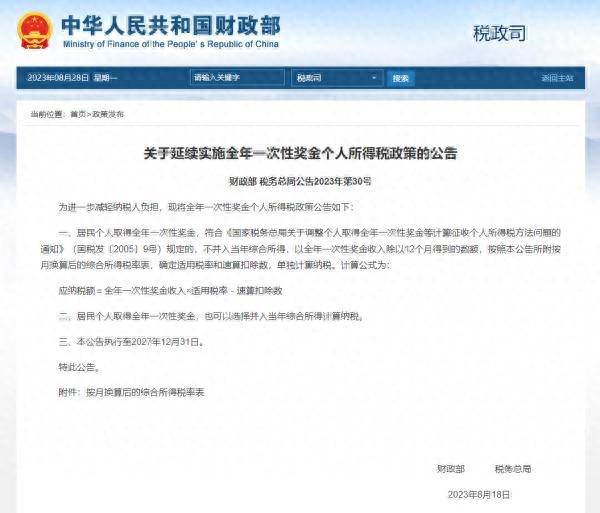 据国家税务总局网站消息,为进一步减轻纳税人负担,现将全年一次性奖金个人所得税政策公告如下: