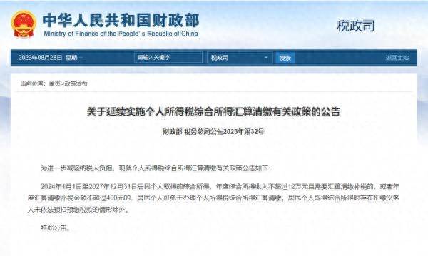 关于延续实施个人所得税综合所得汇算清缴有关政策的公告