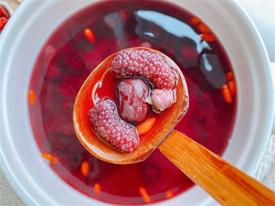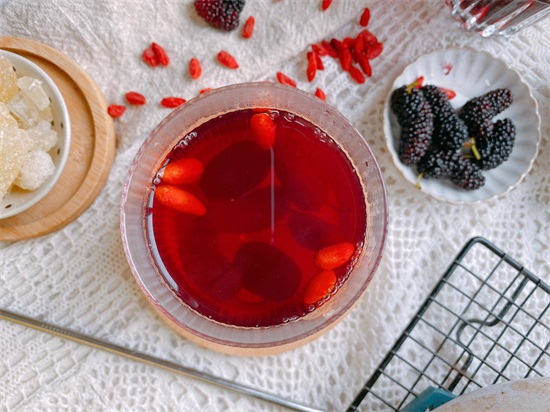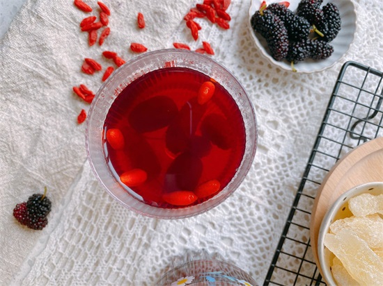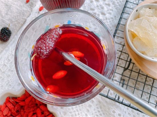 2、枸杞养生果茶中可以放冰糖,也可以不放,因为桑葚和红枣都是有甜度的;