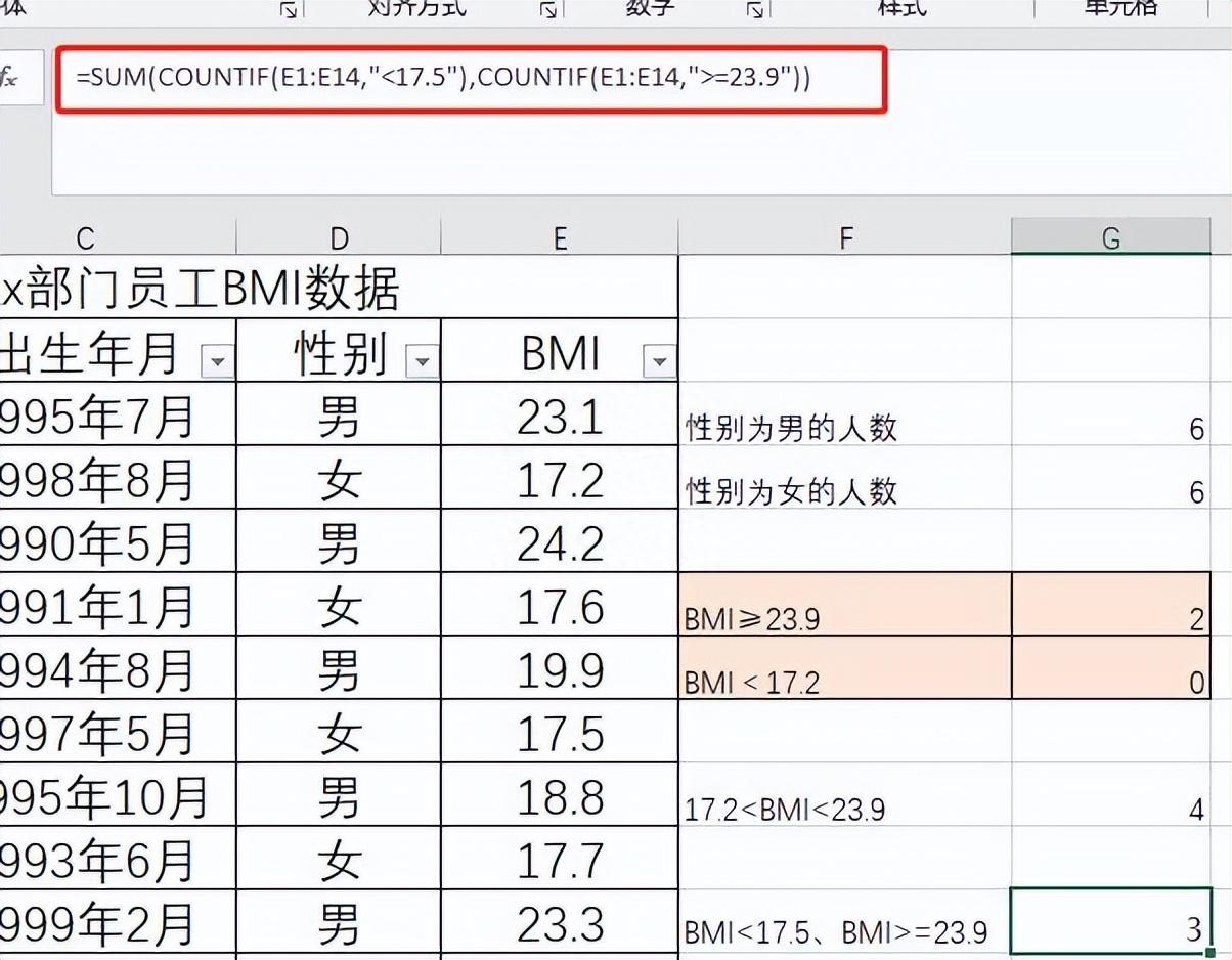 1、例如我们需要统计多个条件,①男士,②BMI在17.2–23.9 kg/㎡的人数