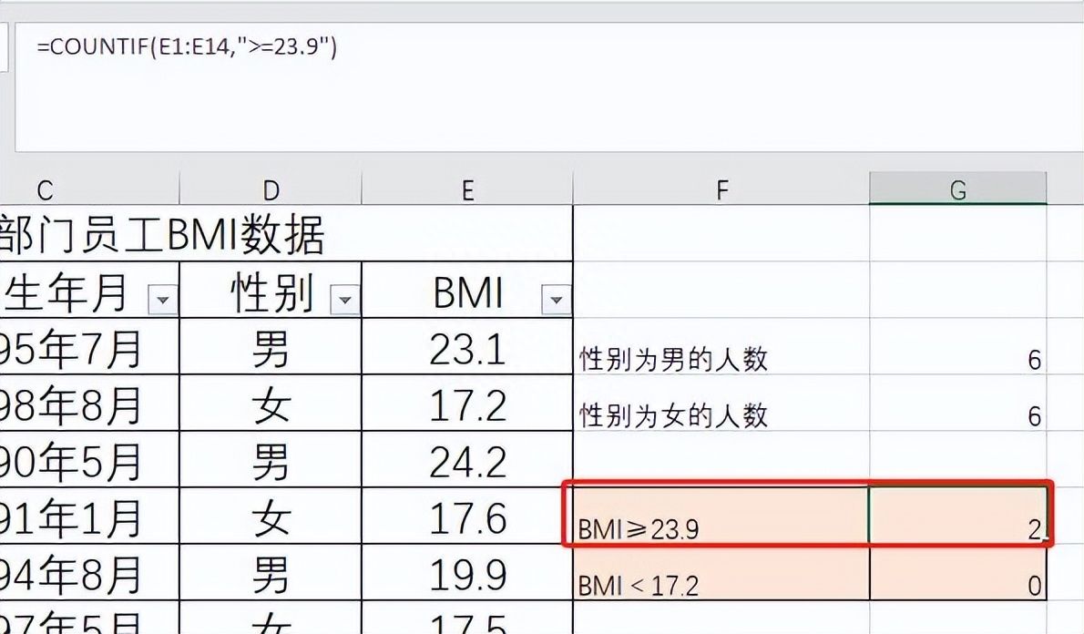 2、分别统计BMI数据中,大于等于23.9、以及小于17.2的人数,条件给出的是表达式