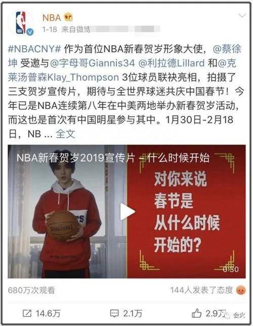 2019年初,蔡徐坤担任NBA新春大使,要知道,NBA在篮球粉丝心中地位很高,蔡徐坤的篮球水平,显然让NBA粉丝排斥起他本人来。