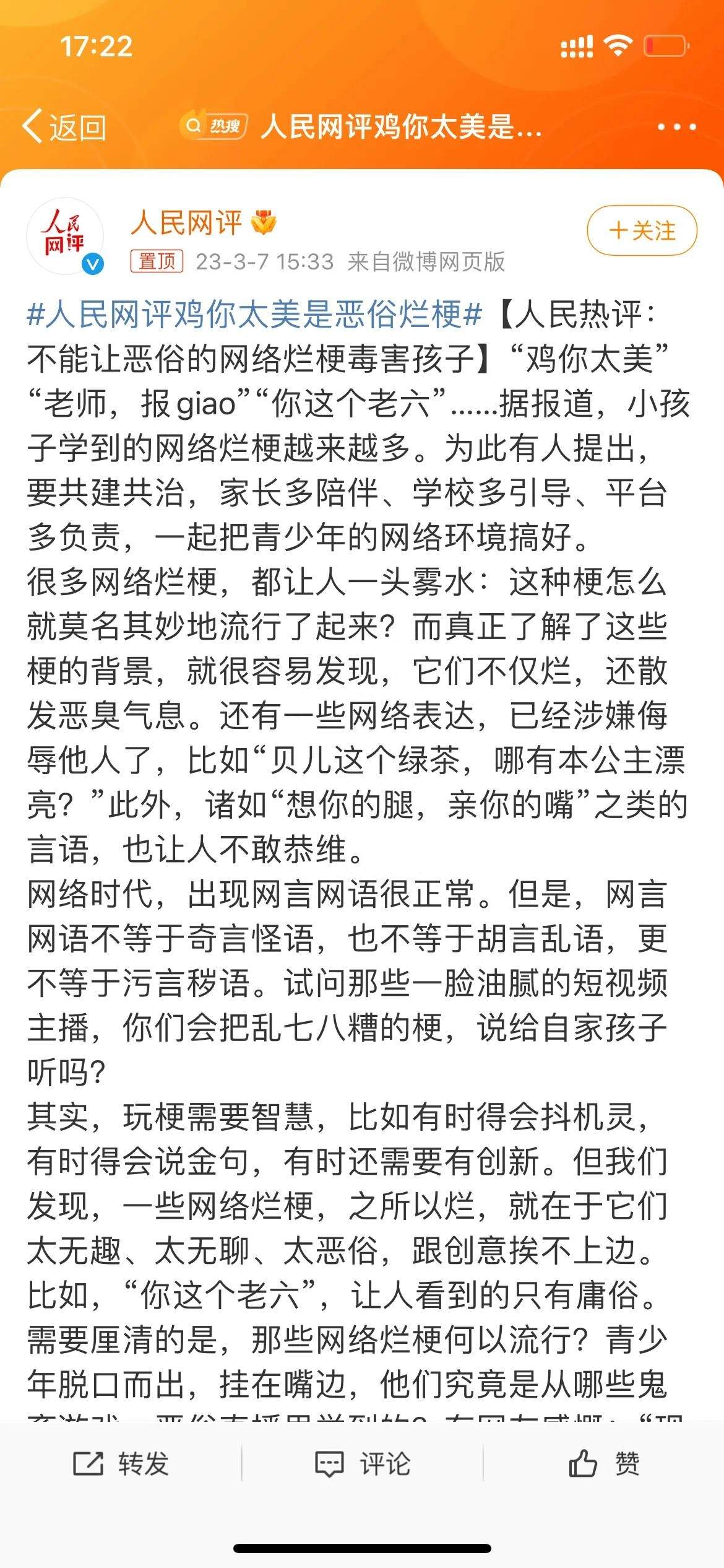 今天有两个热搜,一个是#人民网评鸡你太美是恶俗烂梗#,一个是#鸡你太美商标无一注册成功#,明明没有带那个人的名字,却处处提到那个人的名字。