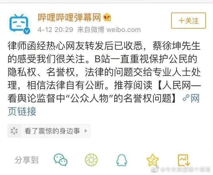 蔡徐坤方向b站发出了律师函警号⚠️,他的粉丝并没有放心太久,b站回复了一个维护名誉权失败的案例,而且因为蔡徐坤的律师搞错了b站的公司,发错了律师函,b站就说经过网友转发知道了这件事,狠狠地内涵了蔡徐坤。