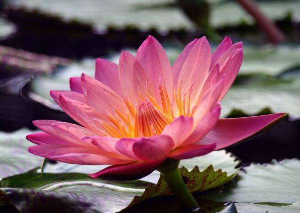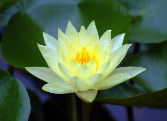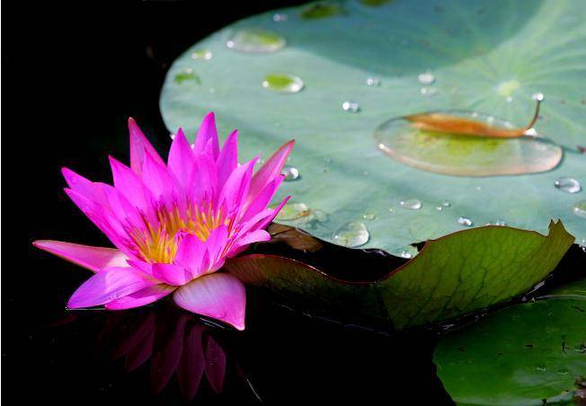 睡莲(学名:Nymphaea L.):睡莲是多年生浮叶型水生草本植物,根状茎肥厚,直立或匍匐。叶二型,浮水叶浮生于水面,圆形、椭圆形或卵形,先端钝圆,基部深裂成马蹄形或心脏形,叶缘波状全缘或有齿;沉水叶薄膜质,柔弱。花单生,花有大小与颜色之分,浮水或挺水开花;萼片4 枚,花瓣、雄蕊多。果实为浆果绵质,在水中成熟,不规律开裂;种子坚硬深绿或黑褐色为胶质包裹,有假种皮。花期7-10月,昼开夜合。