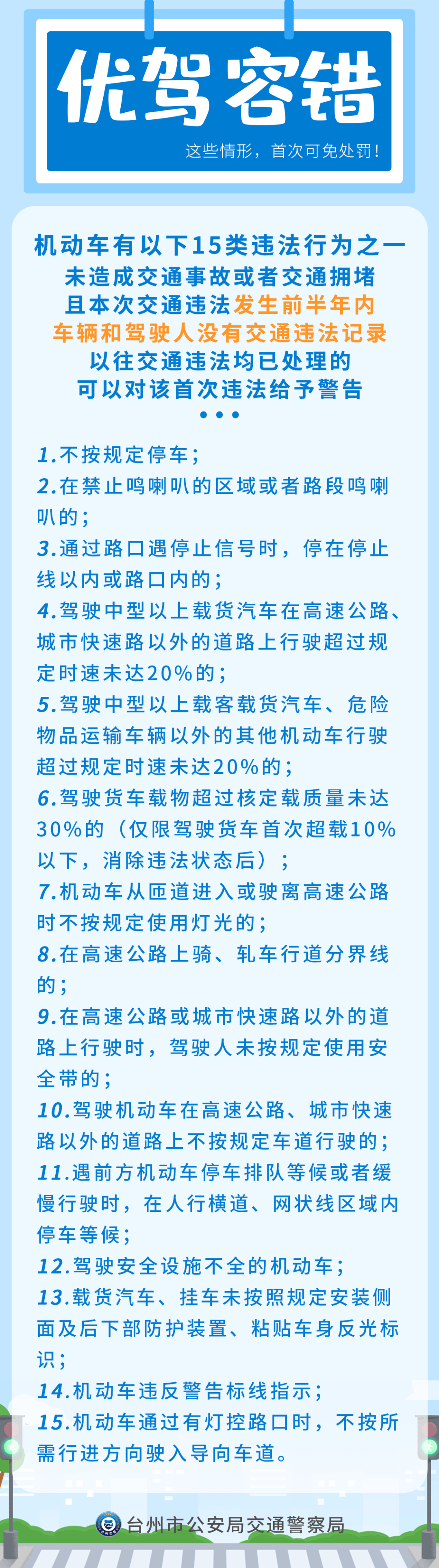 “优驾容错”措施适用对象是面向所有机动车。对于15类“首违警告”交通违法行为,前提是本次交通违法发生前半年内,车辆和驾驶人没有交通违法记录、以往交通违法均已处理的,可以给予警告。现场执法时,因网络等原因无法核实是否属于半年内首次违法、以往交通违法已处理的,按照首次违法作出警告。