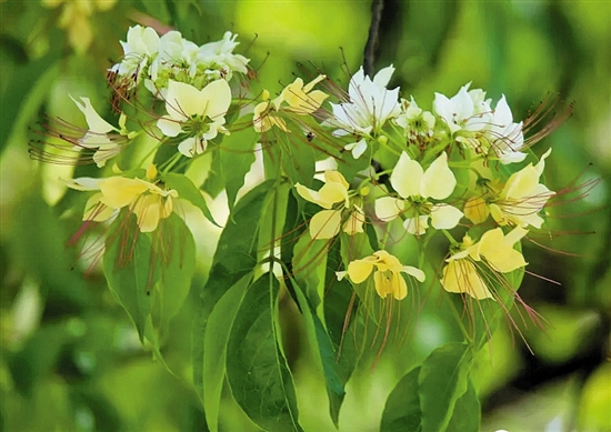 台湾鱼木又叫树头菜、三脚桌,山柑科乔木,高3-15m,3-5月开花,三出复叶,花瓣叶状,初开为白色,继而转黄色,其紫红色的花蕊则向外伸长,细细长长随风飘舞,像鱼儿在水中浮动的触须。花开时多且艳,聚生枝顶,相当醒目。有说法称,因其木材质地轻软,可雕刻成小鱼状,用来钓乌贼,故名“鱼木”。鱼木花粉也是端红粉蝶、黑点粉蝶、纹白蝶、淡黄蝶等蝴蝶的食物,故花开灿烂时,四周常见蝴蝶纷飞。该物种为中国植物图谱数据库收录的有毒植物,其毒性表现为树皮和果实有毒,但其根、叶亦可入药。