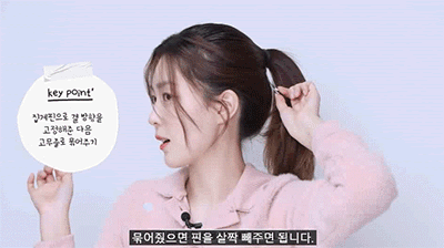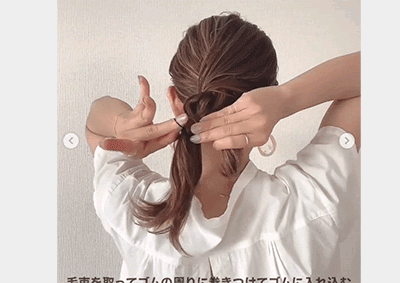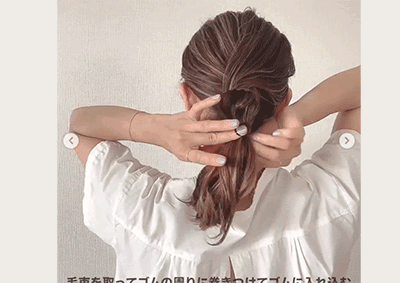 在橡筋处绕两圈,把橡皮筋挡住,发尾塞进一直没有松手的皮筋里。