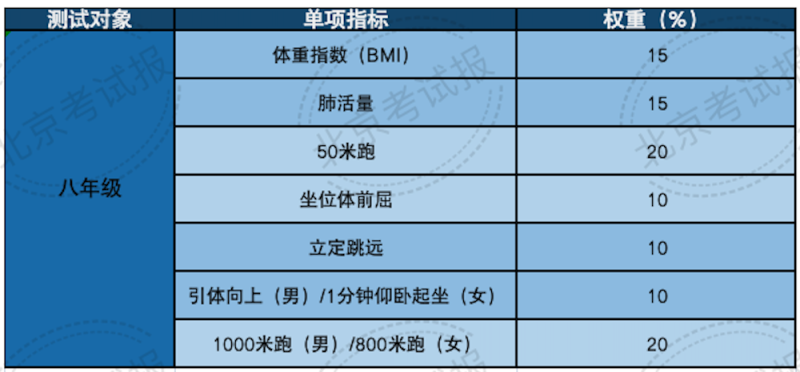八年级测试项目:①体重指数(BMI),②肺活量,③50米跑,④