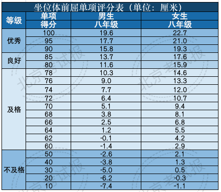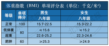 标准分由各单项指标得分与权重乘积之和组成,满分为100分,附加分根据实测成绩确定,即对成绩超过100分的加分指标进行加分,满分为20分。八年级的加分指标为男生引体向上和1000米跑,女生1分钟仰卧起坐和800米跑,各指标加分幅度均为10分。