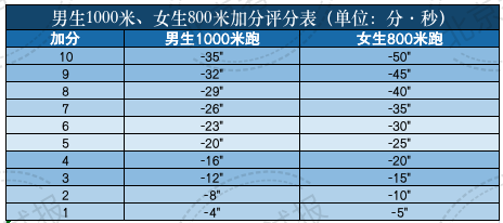 【注】1000米跑、800米跑均为低优指标,学生成绩低于单项评分100分后,以减少的秒数所对应的分数进行加分。