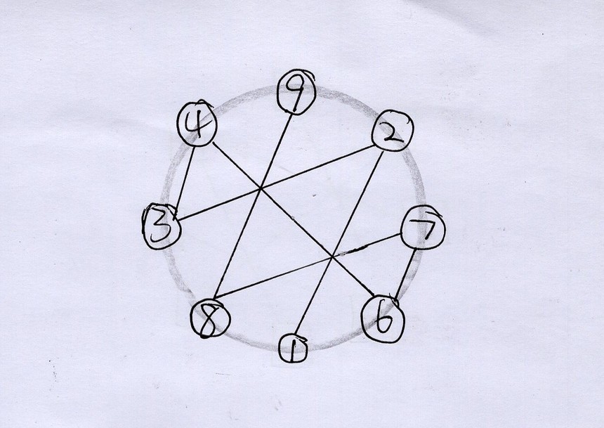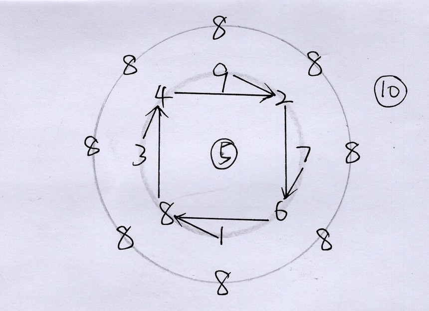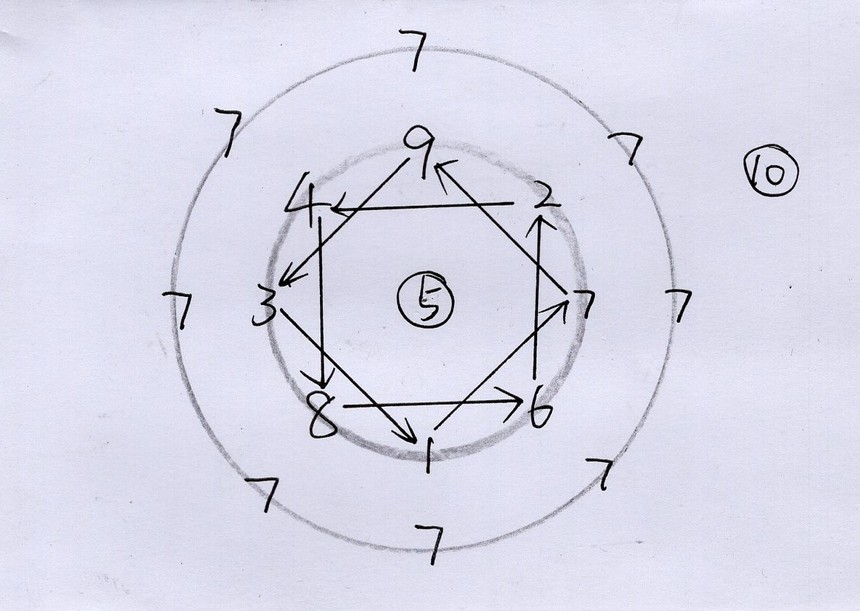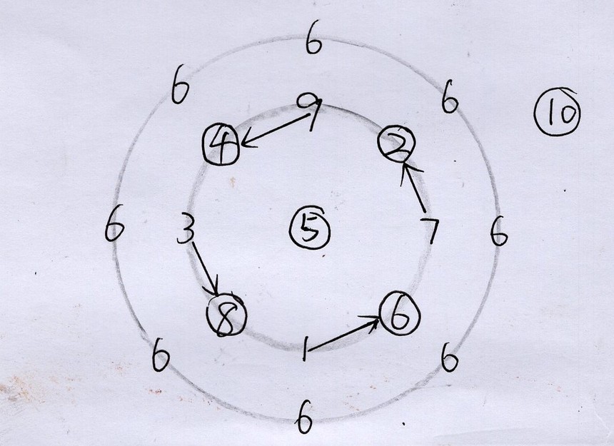 当数理结果等同于本宫位时,以圆圈圈住该宫位数字以表达该种数理过程。如在X-6中,6与6相乘得36,六宫指向六宫,那么在洛书的六宫上画一个圈,代表这种数理过程为:六宫回归于自身。