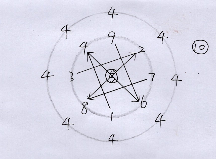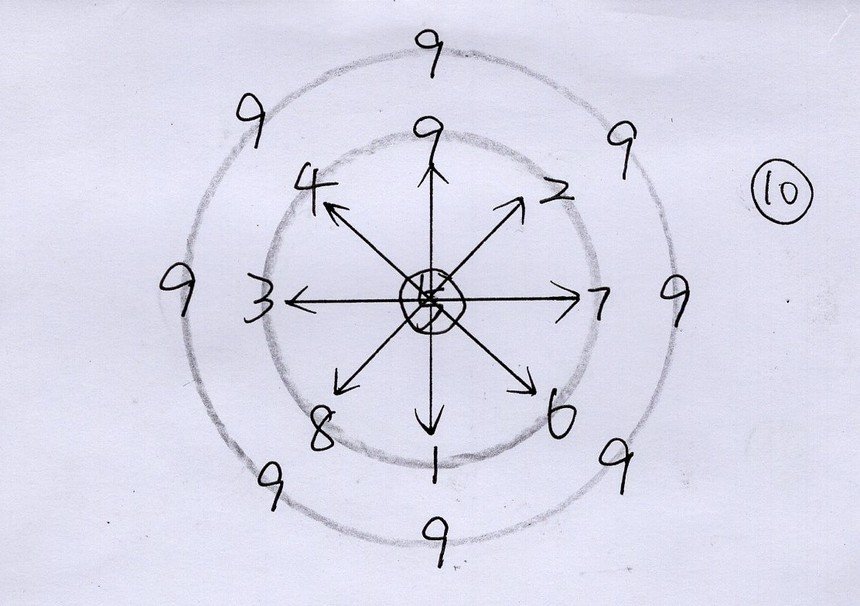 对于X-9,其数理表现和X-5有类似之处。但需要明晰二者的区别,在X-9中,数理过程是跨过中宫而指向对宫,而在X-5中,所有的数理过程都指向中宫。如9乘以9得81,九宫指向一宫,而非九宫通过/穿过/经过中宫后指向一宫