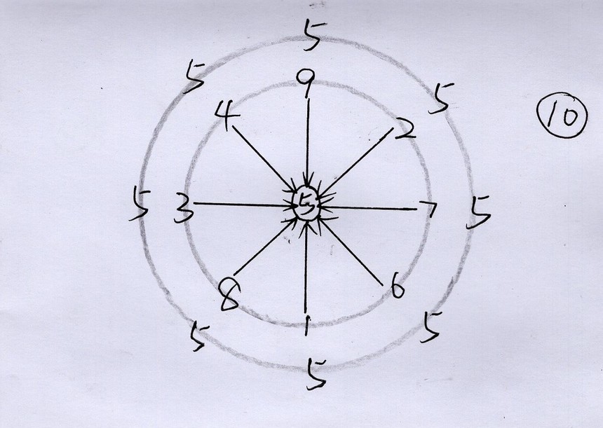 对于洛书,任何宫位数字乘以5,其数理结果非5即0(尾数),那么各宫则统一表现为指向中宫的数理变化,另需注意的是洛书的中宫隐藏着“10”这个数字,由此四隅宫(偶数宫)乘以“5”的数理结果有了归宿。