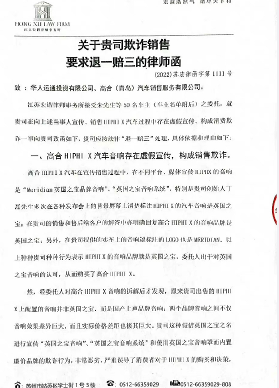 7月5日,一则关于高合汽车欺诈销售、要求退一赔三的律师函在网络上广为流传,核心内容直指: