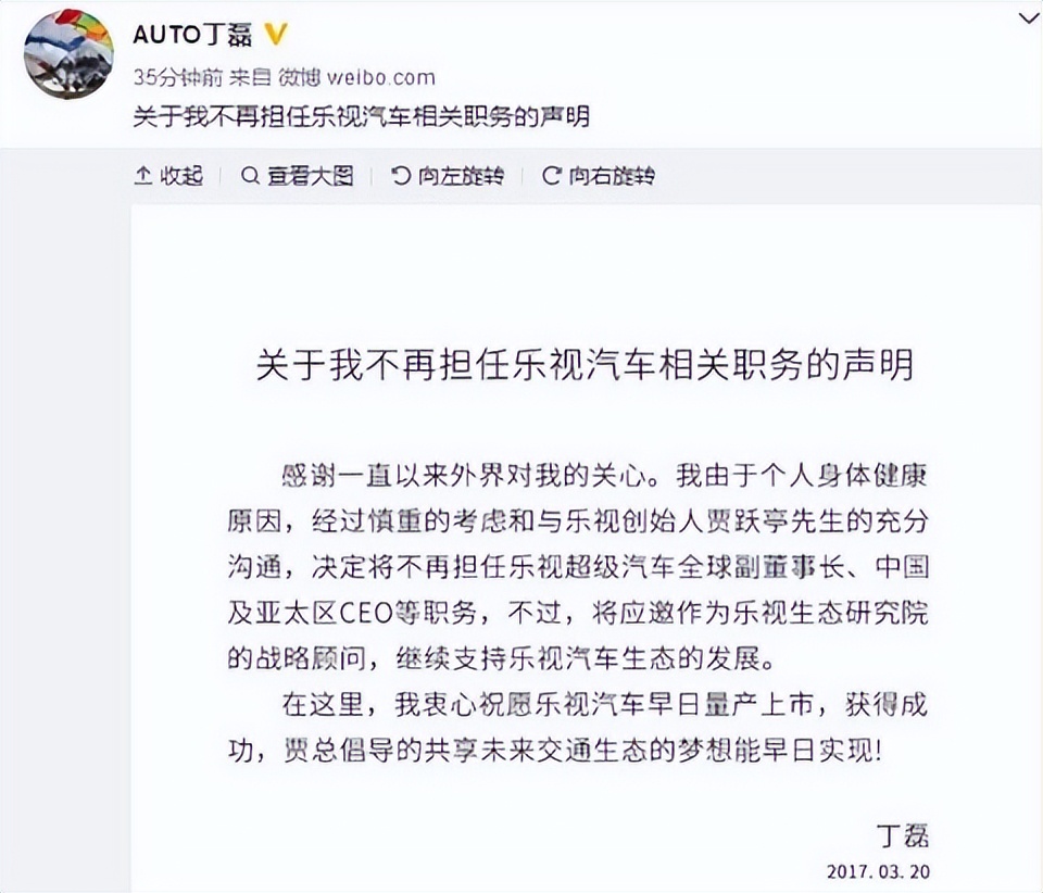2017年3月20日,丁磊通过微博宣布,由于“个人身体健康原因”不再担任乐视超级汽车全球副董事长、中国及亚太区CEO 等职务。