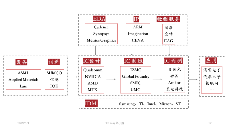 制造一块小小的芯片,涉及50多个学科、数千道工序。包括设计、制造和封装三大环节。在此基础上又延伸出上游的材料、EDA(Electronics Design Automation设计辅助工具)、检测服务等细分行业,并最终应用至无数品类的硬件终端。