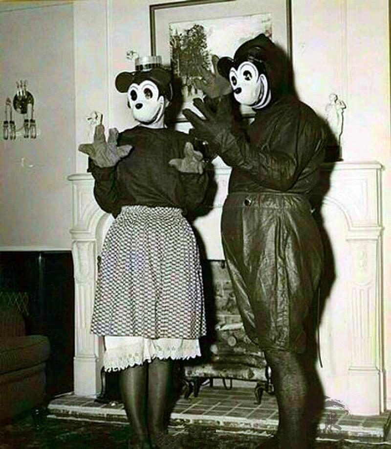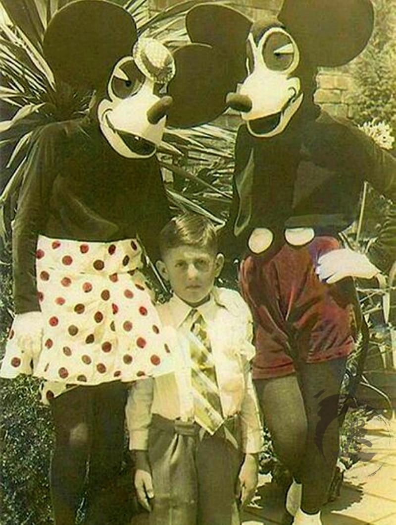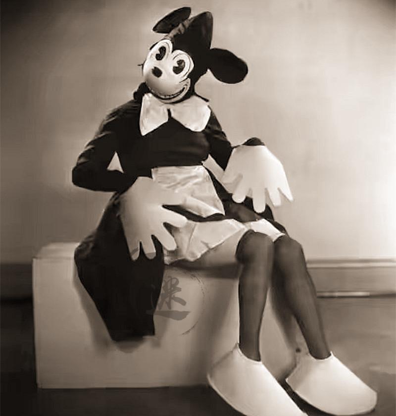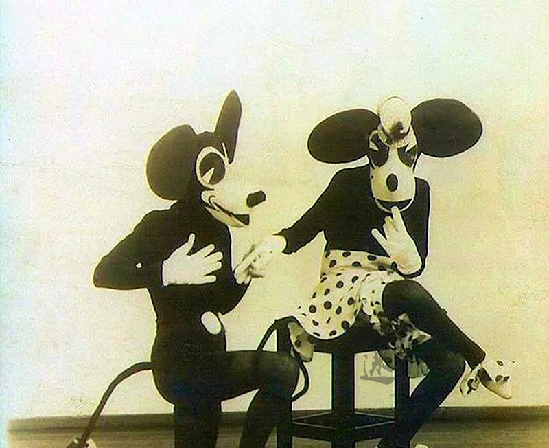 我看到米奇和米妮戴着头套。头套上的表情夸张而可怕。他们的衣服也很紧,可以突出他们纤细的四肢。它们无法与现在圆圆的米奇老鼠相比。