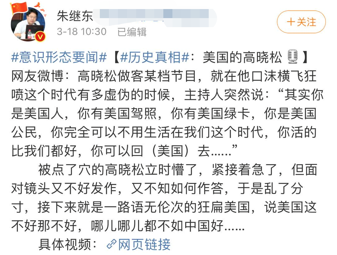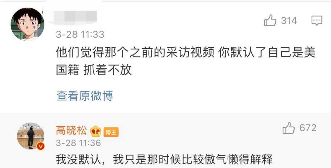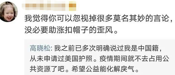 这段视频曝光后,不少网友的疯狂转发,眼看事情发酵越来越大,高晓松终于忍不住,在3月18日下午站了出来,回复一名网友,称“我之前已多次明确说过我是中国籍,从未申请过美国护照。”