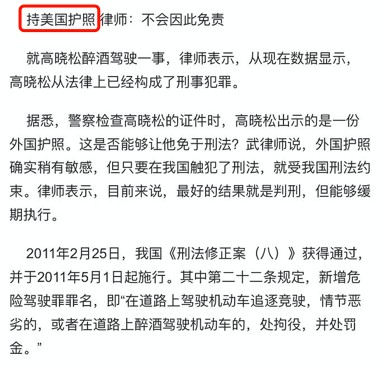 2011年5月10日,高晓松因为涉嫌危险驾驶,被警方刑事拘留。当时有官方媒体报道称,高晓松面对交警,拿出了一本外国护照,立刻引起了整个社会的争论,关于高晓松的美国国籍讨论也越来越多。
